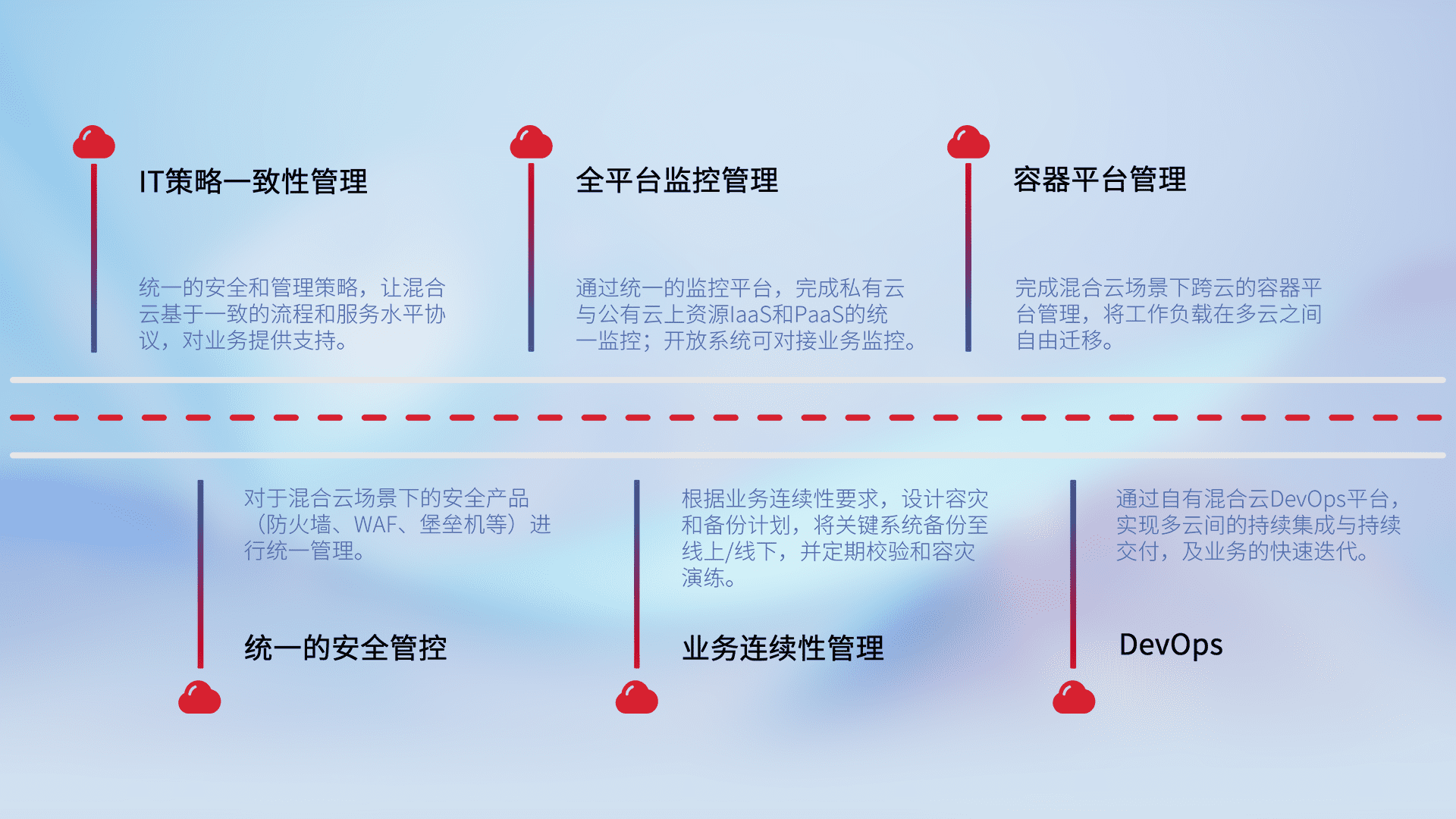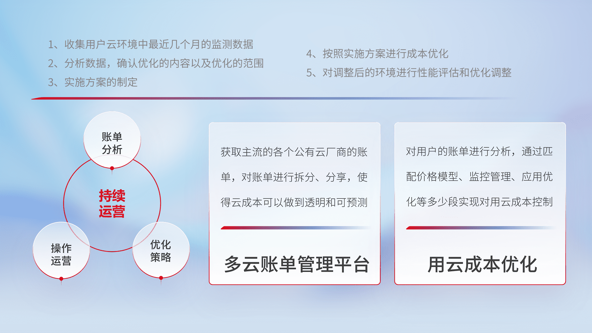 通过多云纳管,,,以统一的资源数据模型把客户的云资源进行抽象和封装,,,,进而实现对多云资源的统一操作,,,,保障云资源管理的可靠性、、、、稳定性与可用性。。。量身定制化运维内容,,,配置、、开发运维、、、、补丁管理、、备份、、、、监控、、认证和访问管理、、审计和日常巡检等,,保障在用云过程中的可靠度,,,,稳定度以及高可用率。。。