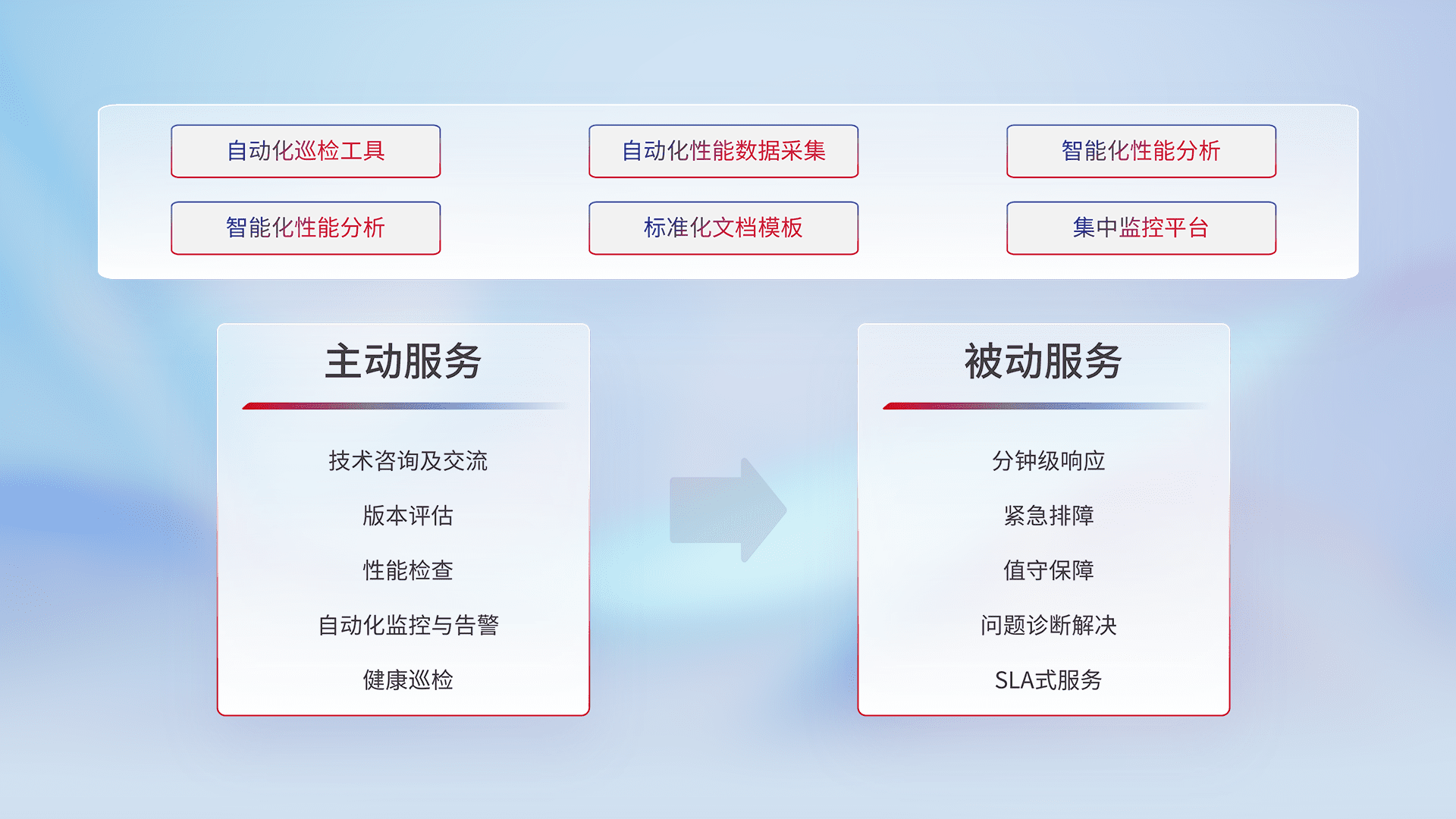 智能化工具和标准化文档,,,保障服务质量,,提供主动服务(包含技术咨询、、、版本评估、、、性能检查、、、、自动化监控与告警、、、、健康巡检)和被动服务包含(分钟级响应、、、紧急排障、、值守保障、、、问题诊断解决、、SLA服务)。。。。
