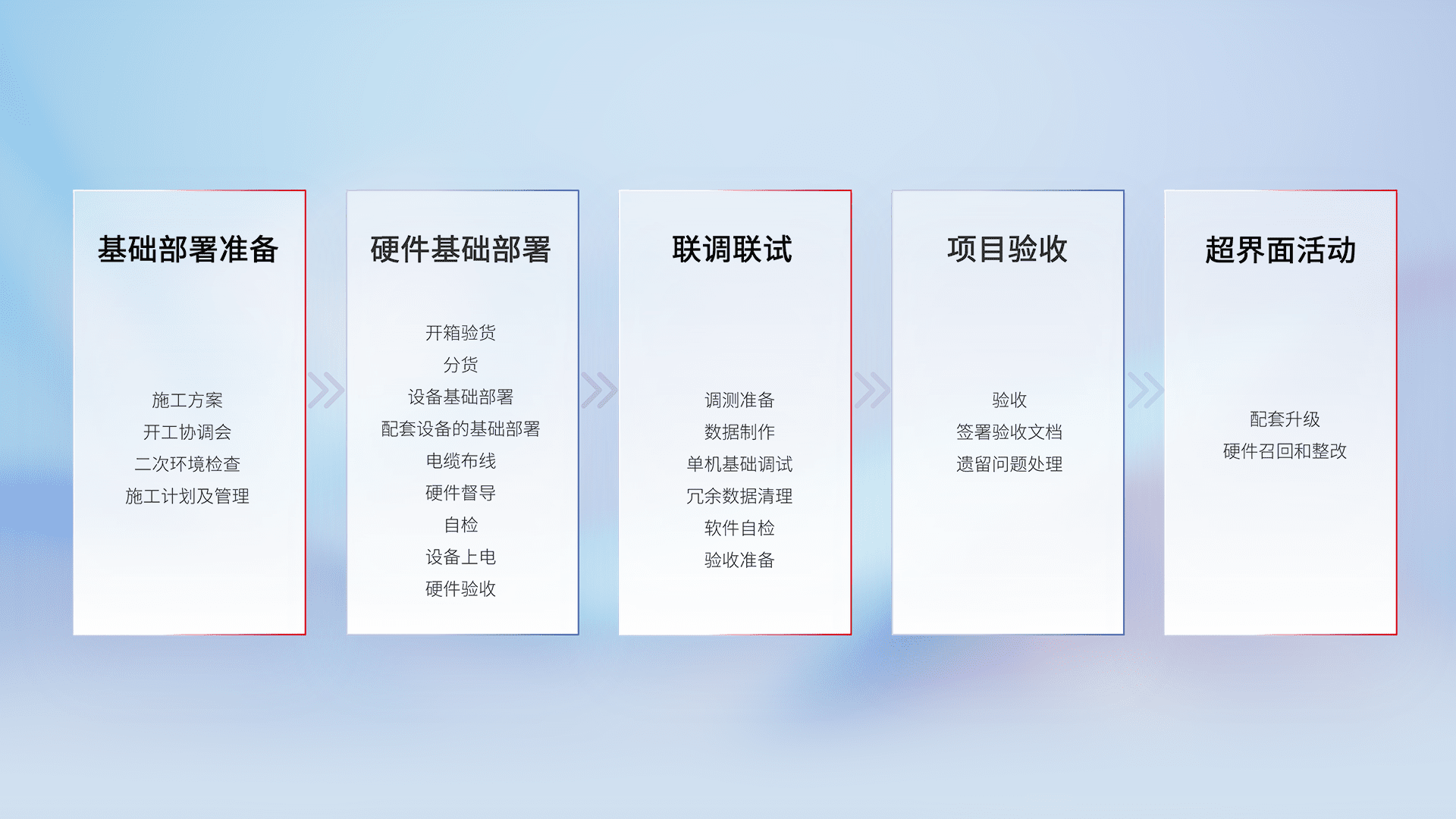 从基础部署准备、、、、硬件基础部署、、联调联试、、、、项目验收、、、越界面活动的全过程可追溯,,保证施工质量和进度。。。。